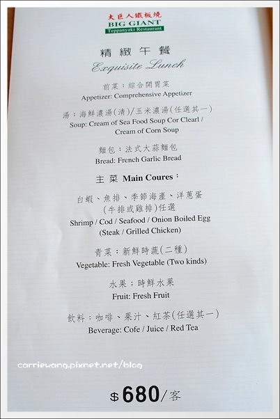 我們這天來大巨人鐵板燒餐廳吃商業午餐,一個人只要980元,對於荷包比較緊的朋友來說,覺得CP值還滿高的。