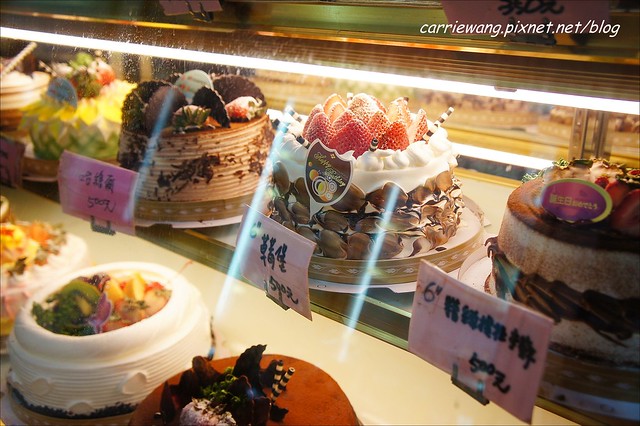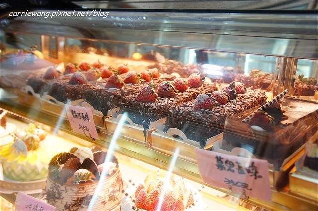 櫥櫃裡有滿滿的蛋糕,不管是完整的還是切片的都有,而且價格都很親民…