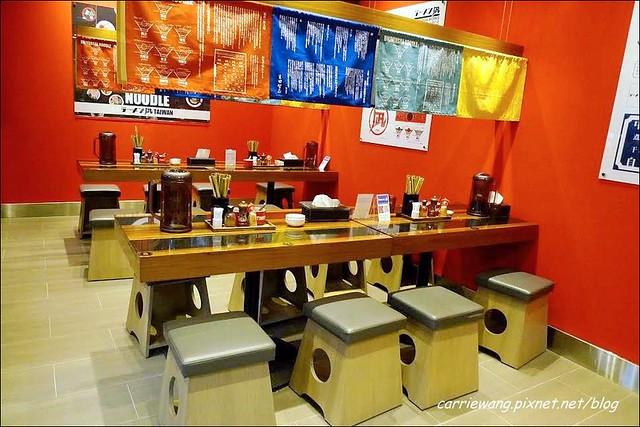 維持一貫的座位區風格,上面都有布簾,寫了一些拉麵的知識和原料,我喜歡這種五彩繽紛的配色,讓視覺上更加活潑…