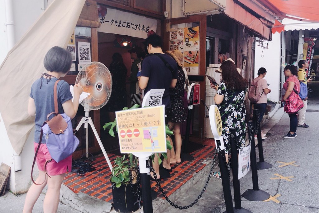 隔天早上直接步行到「牧志市場」,這裡有好吃的「豬排蛋飯糰」,其實沒有想像中排的那麼久,大概15分鐘就買到了…