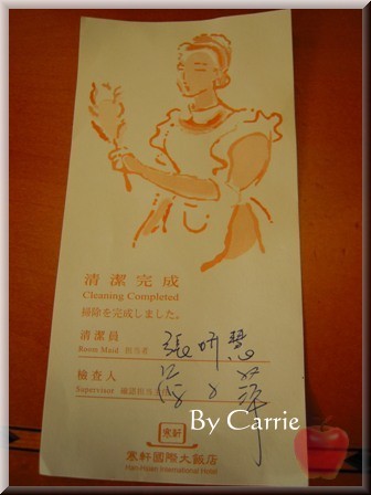 櫃子上放著一張卡,有註明房間的”清潔員“和”檢查人“…算是清潔掌控嚴格哦!