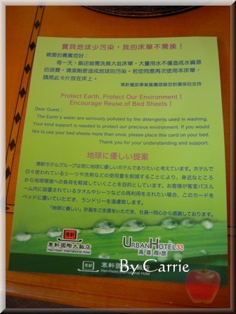 另一張卡則是寫明了→因為愛護地球,所以連續住宿的話,床單也是不換的,有需要更換的話把卡放在床上便可…