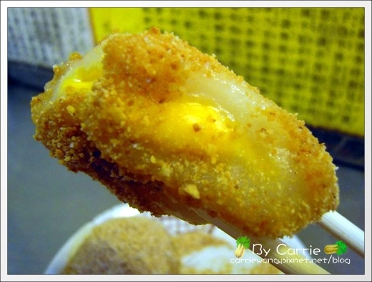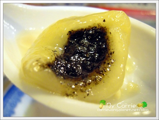 QQ的麻糬中包著微鹹的起司,我覺得口感很特別,但是甜的食物中間包著鹹的口感,我和Kevin比較吃不慣,看完其他網友的食記才發現,我應該點”燒蜜麻糬”才對!因為”燒蜜麻糬”是不包餡的,我比較愛這種單純的美味…
