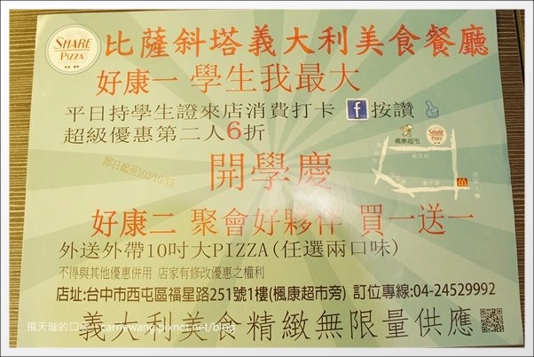 應店經理邀請,這天和朋友來到這間位於逢甲商圈的《Share Pizza 比薩斜塔》聚餐,這間是新開不久的餐廳…