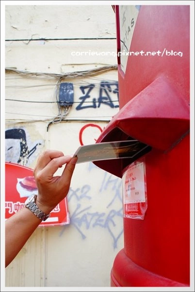 我們在附近的紀念品店買了張明信片,大三巴牌坊前就有小郵局,買了郵票貼上去就可以寄…