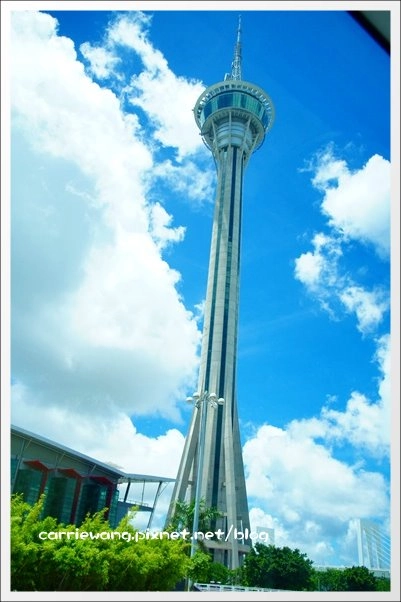 途中就會經過《澳門旅遊塔》…我問Kevin想不想去玩高空彈跳,Kevin說:「不不不…我想要走走看看就好!」
