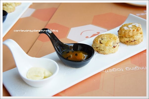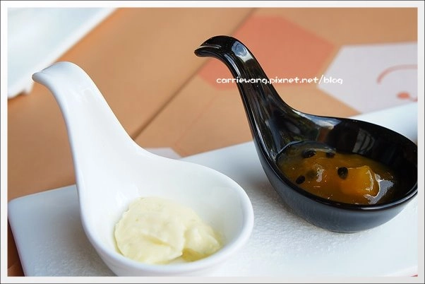 可以沾奶油或是百香果醬一起食用…不過因為整個set的份量比我們想像中的多,所以司康我們都沒吃,最後由貴婦Anges外帶回家…