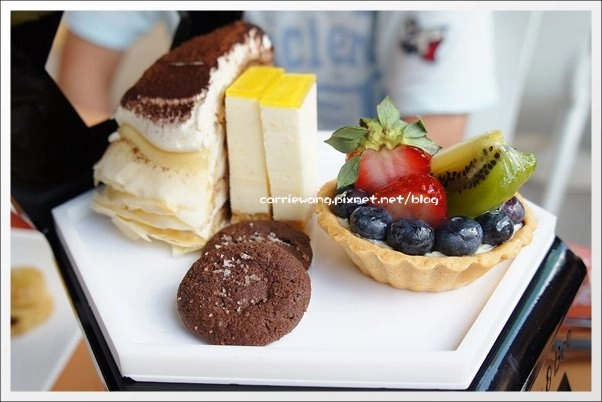 中間的甜點種類有:提拉米蘇(躲在後面沒拍到)、手工餅乾、乳酪蛋糕和水果塔(一款是藍梅、另一款是葡萄)…