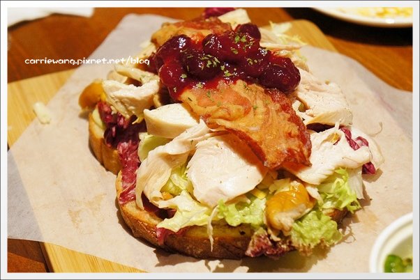 上面的蔓越莓醬是店家精心特製的哦!搭配起來的口感酸酸甜甜又鹹鹹,超開胃的啦!(金害~