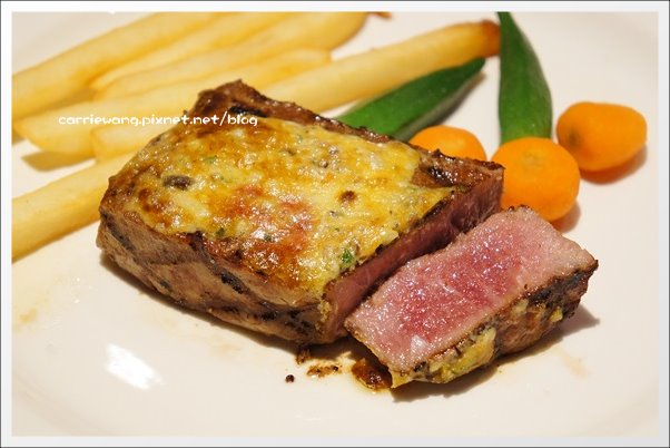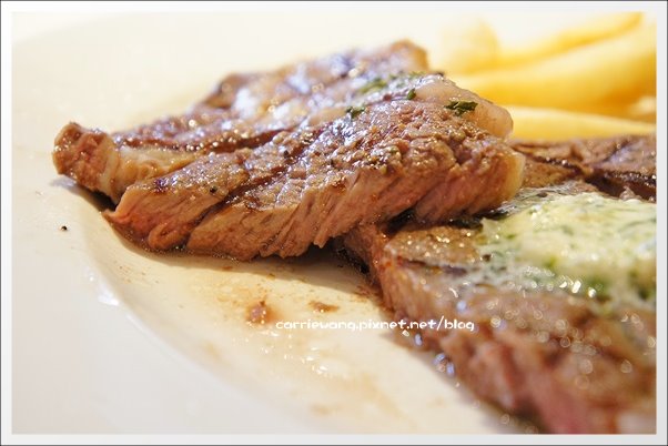 我點了5分熟,不過看這剖面秀…血水比想像中的還少一點!應該是7分熟的吧?因為是肋眼的部位,所以口感比較有咬勁,筋也比較多!