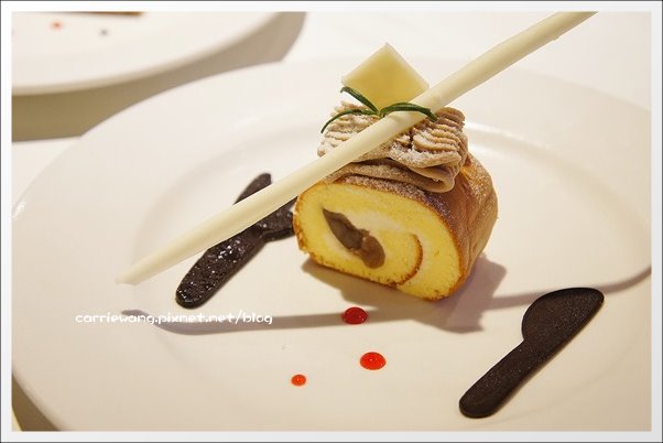 栗子蒙布朗蛋糕捲 – 有發現盤子上還有小小的刀叉嗎?那是巧克力做的,也可以吃歐…