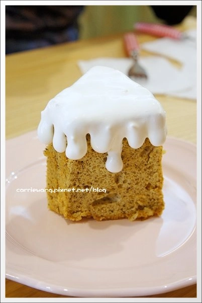 伯爵紅茶戚風 – $70元,上面的奶油是店家自製的,因為紅茶關係,所以吃起來會有點沙沙的口感,我本身比較不愛…