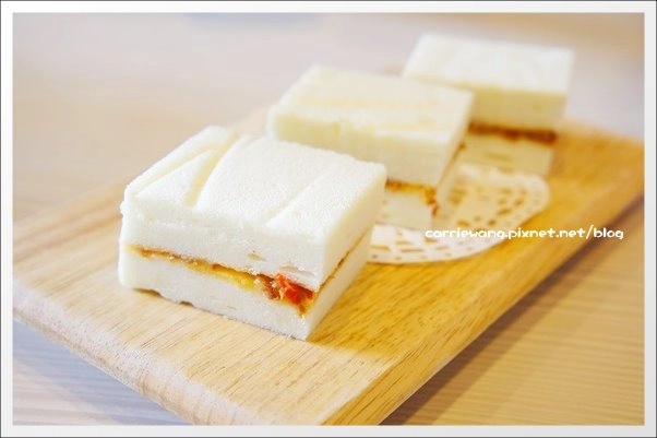 方塊裡面的內餡是干貝,吃起來也是有點鹹甜鹹甜…聽說口味每天不一樣,台中貴婦前一天來是吃到甜口味的…