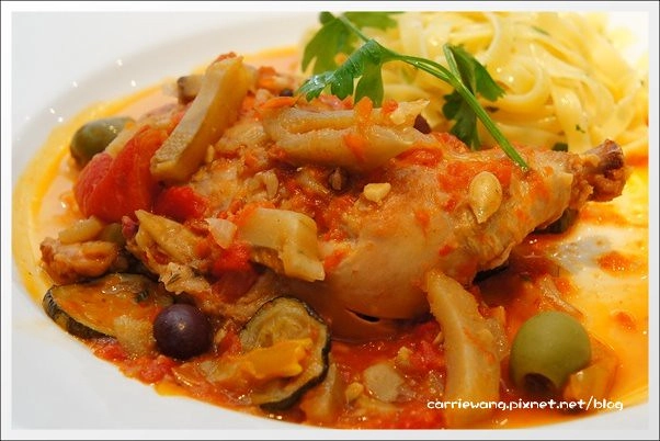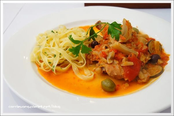 搭配的寬麵也是口感偏硬,很正統的義式作法呀!麵條沒有過多的調味,只有淡淡的橄欖油搭配著淡淡的麵香…