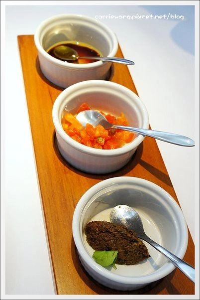 這是麵包的沾醬,總共有三種,由下而上分別是:黑橄欖醬→莎莎醬→油醋橄欖油…我喜歡上面兩款!