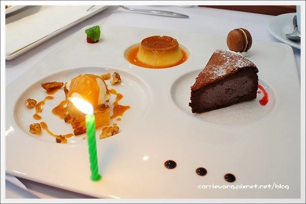 因為我和玫瑰都是12月份的壽星,生日只差一天,玫瑰順口問服務人員生日有什麼優惠嗎?居然…來了一大盤甜點拼盤耶!