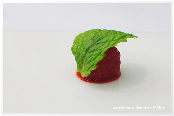 我剛剛那盤義大利麵真的吃太飽了,甜點拼盤中除了這顆不甜不酸的覆盆莓外,其他都吃不下…(殘念…