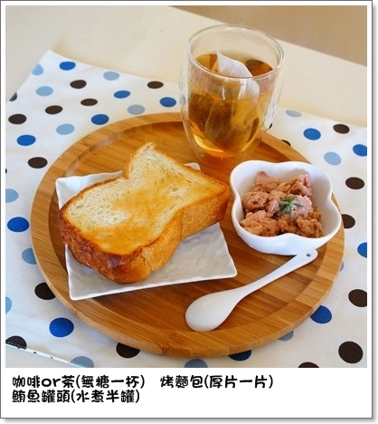 這份食譜的午餐都比較簡單一點…我很不愛吃”魚”,所以這一餐麵包吃的很開心,鮪魚吃的很痛苦…