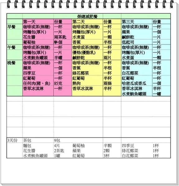 這份《榮總三日減肥法》在網路上流傳已久,不過聽說榮總有出來否認…後來又說是台大的,不過台大也否認…(←幹嘛這樣,那算我的好了!)