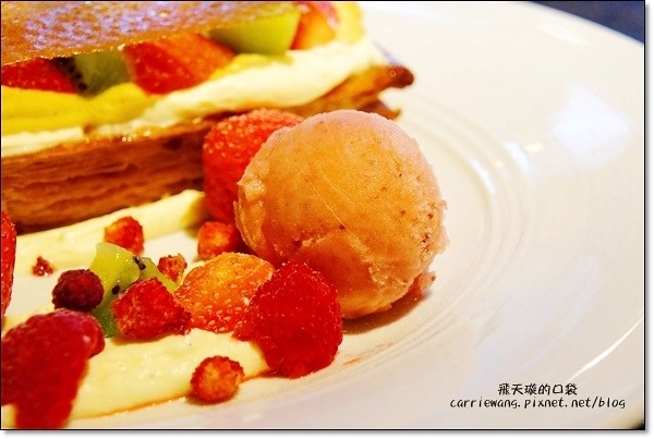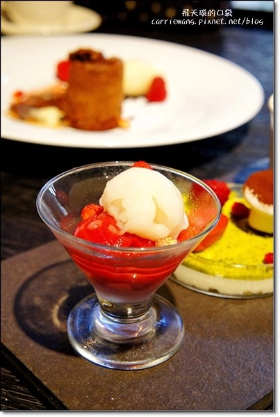 還有附一球雪酪,記得好像是莓果口味的,酸酸甜甜的…