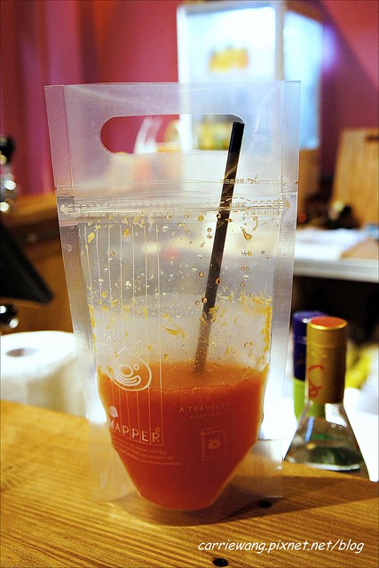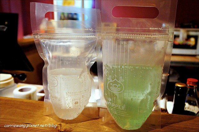 氣泡水蜜桃(左) – $90元,我們家凱文不喝酒精類,所以點了這款泡水系列,其實喝起來就像甜度比較低的汽水,口感很清爽…^^