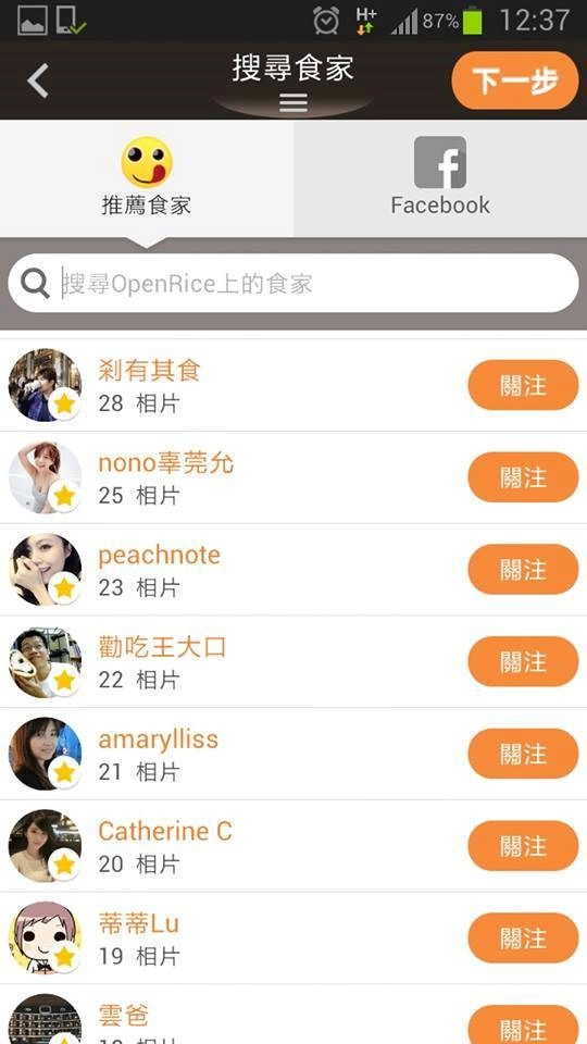 PS.因為帳號已經連結Facebook了,所以也可以透過Facebook來找尋FB上有使用《OpenSnap.開飯相簿》的朋友,再”關注”他就可以了!