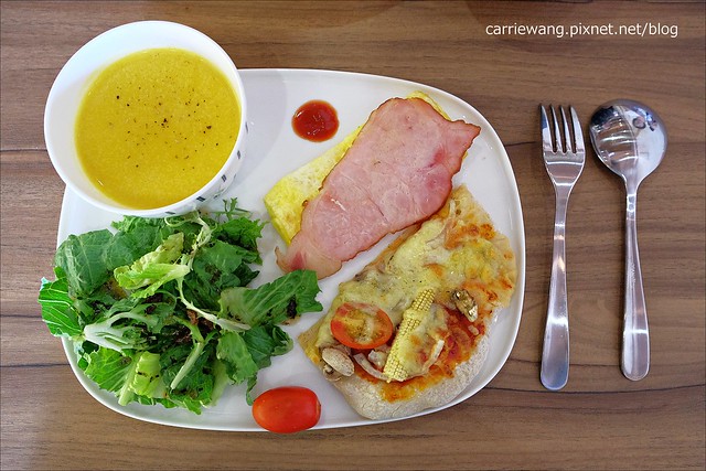 手工麵包套餐 – $140元,附餐可以選擇濃湯or蘋果汁,不確定麵包種類是不是每天都會更換,這天吃到的是pizza,麵包外皮QQ的,裡面軟軟的,配料就是一些蔬菜類…