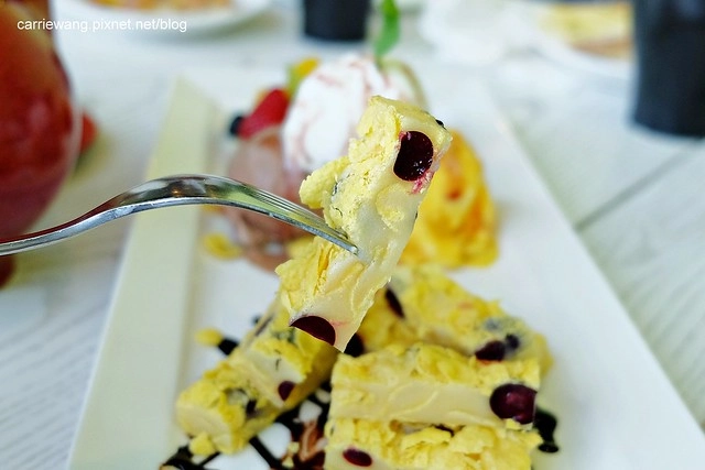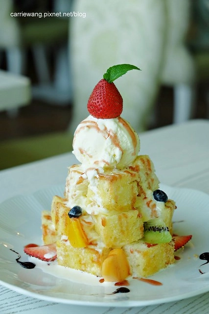 繽紛果漾蜜糖金磚 – $260元,吐司上面裏上了一些糖粒,再搭配新鮮的水果和冰淇淋,口感酥酥脆脆的…