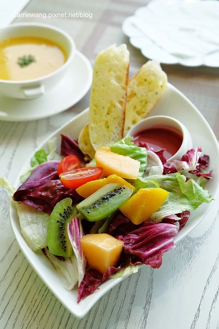 田園蔬果沙拉佐黑醋栗醬 – $180元,會點這道完全是因為它長的很像七彩霓虹燈的關係…上面的水果鮮甜好吃,下面的蔬果可以佐以旁邊的黑醋栗醬一起吃…