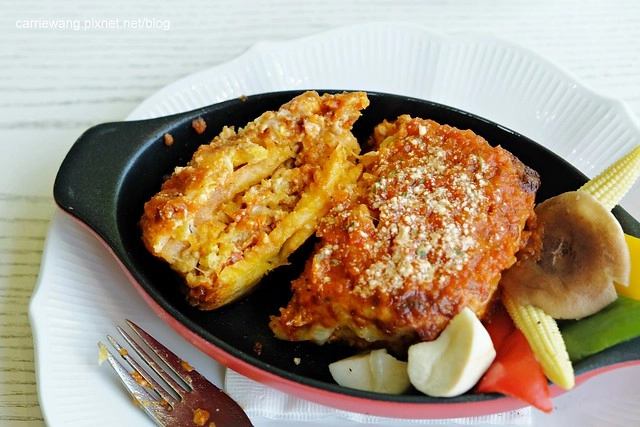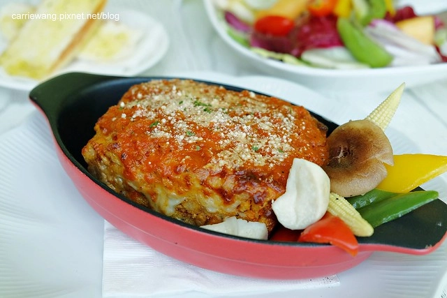 中間有起司和義大利肉醬,整個千層都有入味了,而且肉醬的份量還滿多的,記得搭配旁邊的蔬菜一起吃才不會……(難嗯嗯~XD)