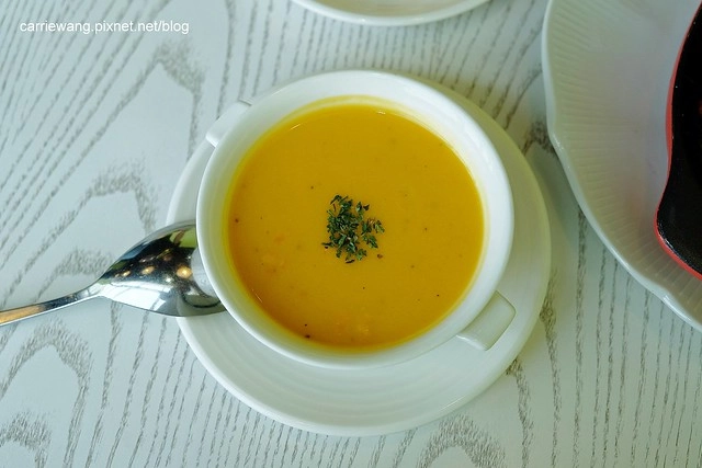 南瓜濃湯 – $59元(加購價),吃飯喝湯是我的習慣,何況”南瓜湯”本來就是我的心頭好,所以就點了…