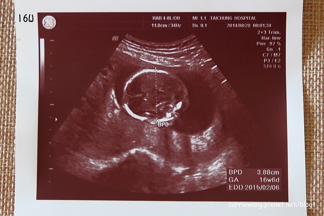 16W的超音波照,因為小baby愈來愈大了,所以只看的到寶寶的頭了…(這天的產檢,因為溫醫師跳槽的關係,所以有大半的孕婦都轉到劉醫師的診,人突然多到爆炸,所以我們竟然半夜12點多才看完診…)…我們很累,但是我們知道醫生和護士更累!