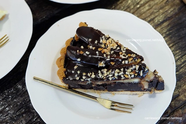 巧克力香蕉布朗尼塔 – $150元,上面是新鮮的香蕉再淋上巧克力醬,還有撒上一些堅果粒,香氣滿濃郁的…