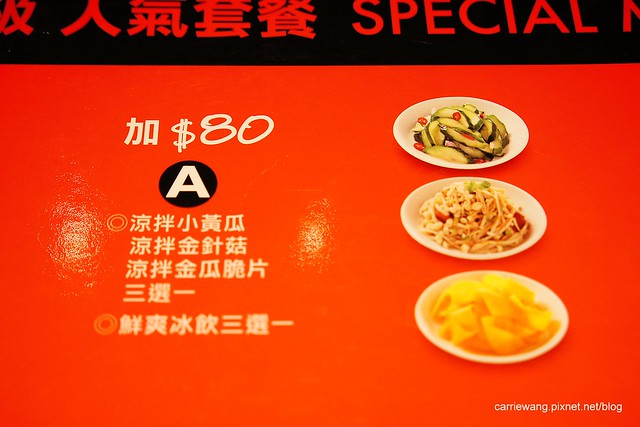 加 $80元可以升級A餐,涼拌小黃瓜、涼拌金針菇和涼拌金瓜脆片三選一…