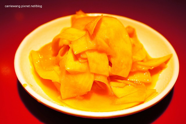 涼拌金瓜脆片 – 金瓜應該就是南瓜的意思吧?可是這一道好像有用水果(百香果?!)醃漬過,所以酸酸甜甜的,而且口感吃起來脆脆的,有點像芒果脆片的感覺…