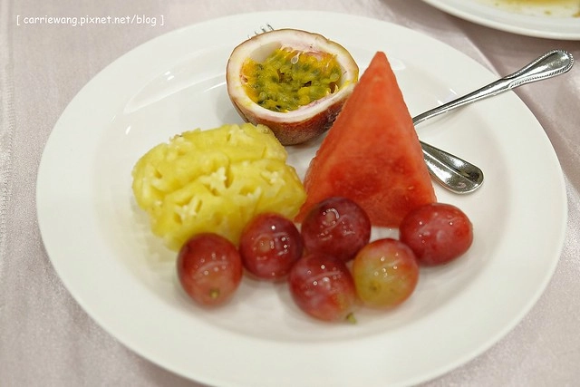 水果 – 吧檯上的餐點是自助式的,有冷盤、湯品、甜點和水果…不過這天因為吃太飽了,所以只拿了水果…