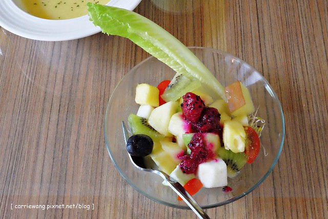 沙拉 – 以新鮮水果為基底,搭配火龍果醬,還滿特別的…只是我不喜歡底部的苜宿芽就是了…