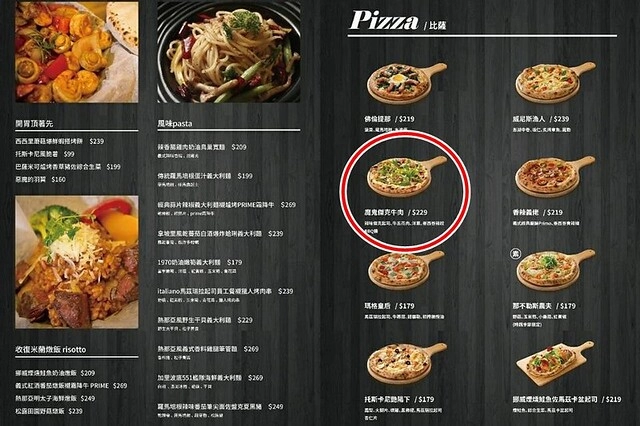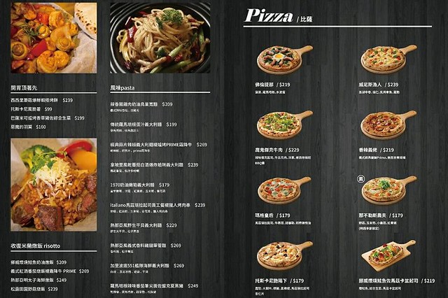 Menu…店裡賣的餐點以義大利麵、燉飯和披薩為主,還有開胃菜和飲料…