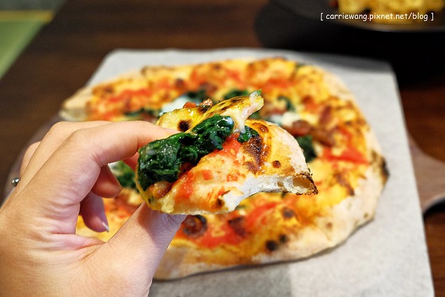 服務人員建議披薩由裡到外直接捲起來吃,麵皮的口感是軟Q帶有嚼勁型的,有點像《鏟子》or《天堂小店》,愈嚼麵香愈明顯,即使放涼了味道還是不錯,只能說他們家的披薩太合我味口了,即使外帶也很划算,列為下次必點!