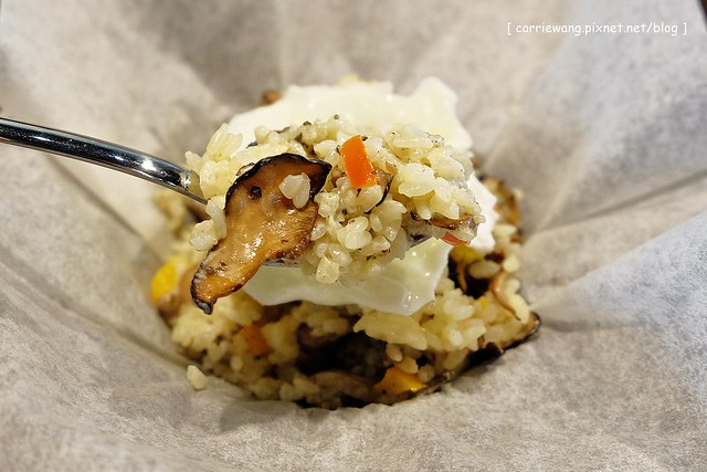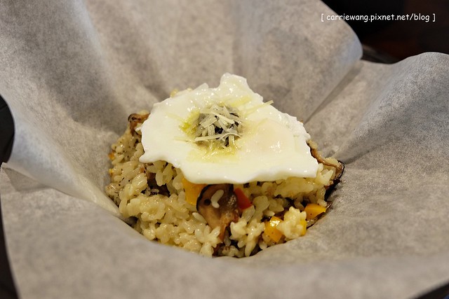 松露田園野菇燉飯 – $239元,燉飯呈現的和我們想像中的不太一樣,下面是用”烘焙紙”包起來,上面還有一顆水煮荷包蛋…