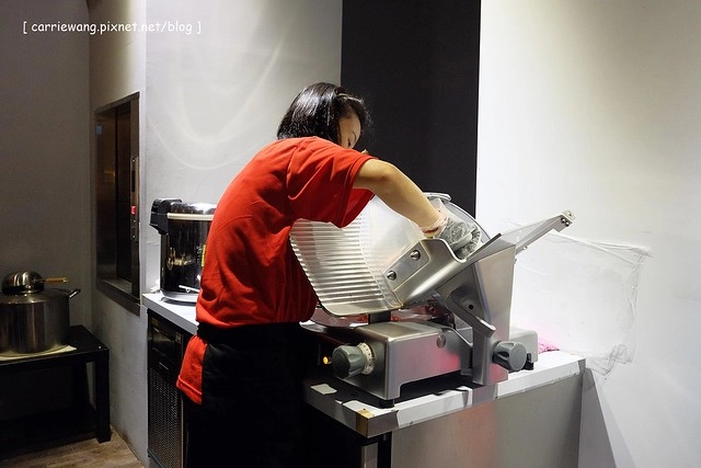 在廚房一角發現工作人員正在努力的切肉中,原來《三道一鍋》為了保持肉品的新鮮,所以都等客人點完餐後才會現切…