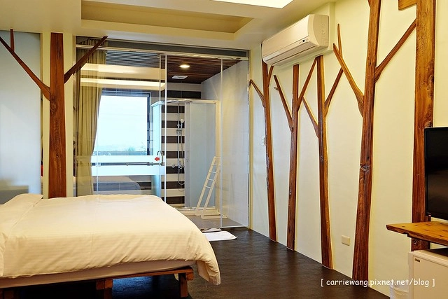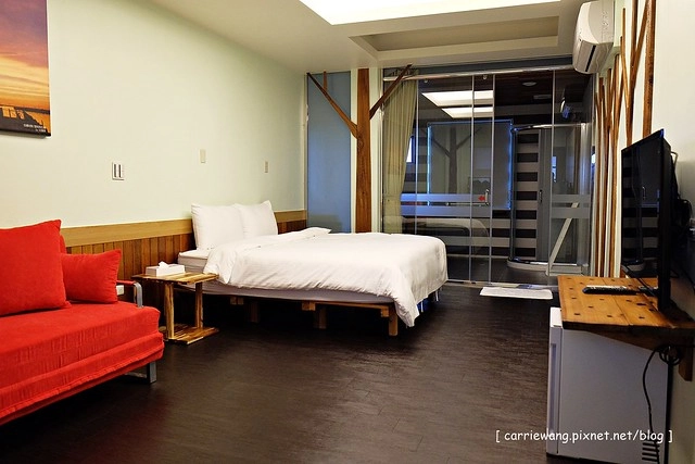 這間是【時尚套房兩人房】,用的是馬賽克木板,床的四周還有柱子,感覺帶點歐洲貴族風…