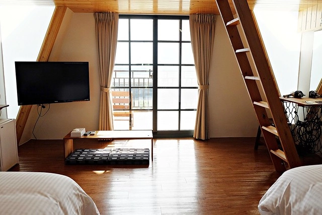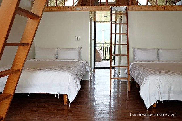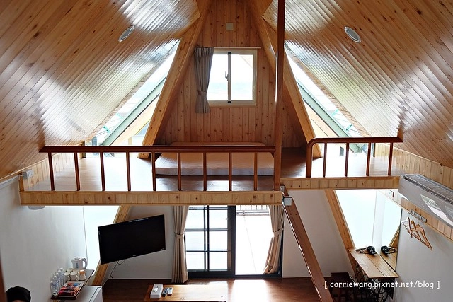 位於三樓的是【閣樓小木屋四人房】,內部以原木裝潢為主,是屬於挑高式設計…