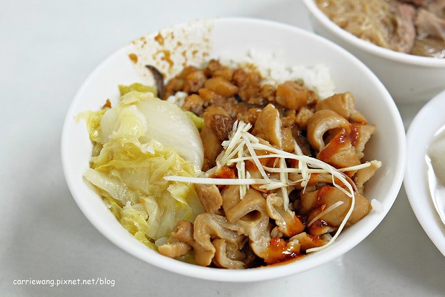 主要配料就是香菇肉燥、大腸和白菜滷,上面蓋了滿滿的料,快要看不到白飯了…一端上桌,香味四溢,真是超誘人的啦!