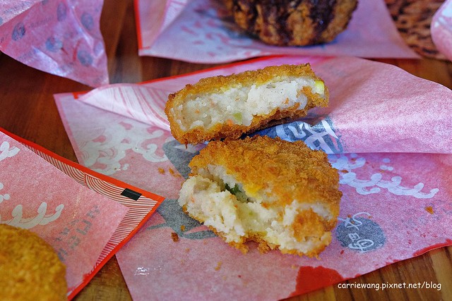 蔬菜口味 – 麵衣吃起來很酥脆,裡面的蔬菜餡料鹹度適中有入味,口感綿密滑順,以炸物來說,這道算是還滿清爽的,我個人很喜歡…