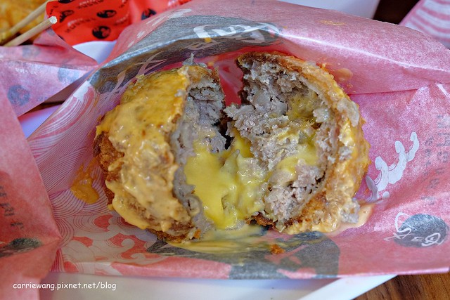 爆漿雷丸內餡除了牛肉本身之外,還有濃郁的起司,這樣一刀切下起司醬就會流下來,看起來是不是很犯規?簡直會逼死人…
