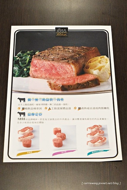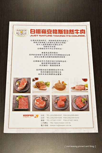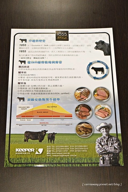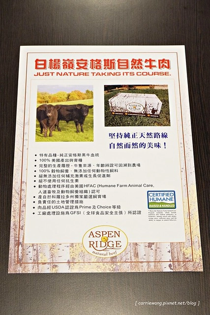 因為前陣子食安問題層出不窮,所以服務人員特別出示了牛肉身份的DM給我們看,《馬克碳烤牛排》使用的都是美國白楊嶺安格斯自然牛肉,品質都是經過檢驗認證的,所以應該是不需要擔心啦!