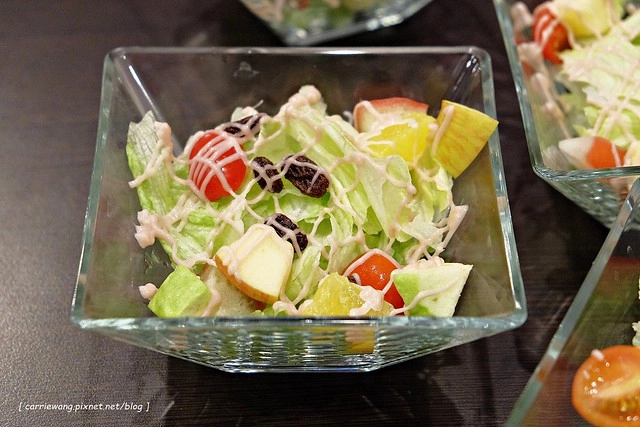 主廚沙拉 – 有美生菜、蘋果、芭樂、鳳梨、番茄和葡萄乾,食材吃來都很新鮮,佐的是藍莓醬,吃起來酸酸甜甜的,滿開胃的…