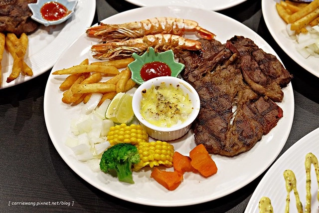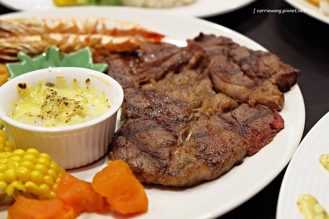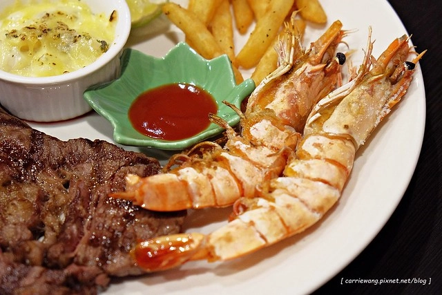 海陸雙拼 – $780元(套餐價),這一道視覺上更豐富澎派了,陸上走的海底游的都有…除了牛排之外,還有鮮蝦和焗烤干貝…