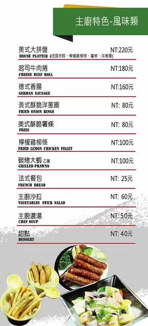 PS.套餐有附:主廚沙拉、法國圓麵包、濃湯、甜點、飲料(紅茶、咖啡、蘇打飲料和可樂)